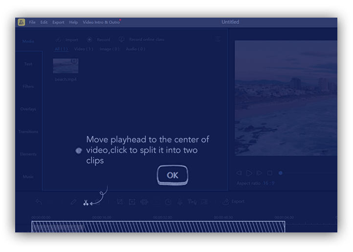 Arraste a marca no meio do vídeo e clique para dividir o vídeo em dois segmentos.