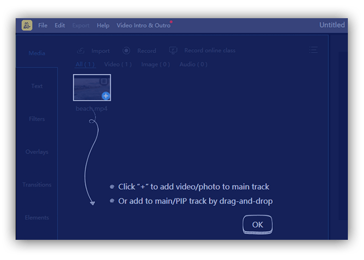 Clique no "+" para adicionar vídeo/imagem à faixa principal ou arraste diretamente para a faixa principal ou a faixa PIP.