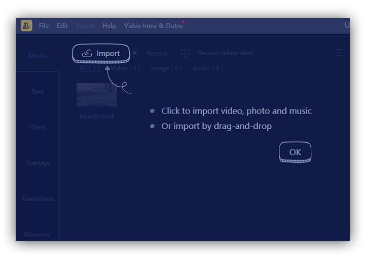 Clique no botão "Importar" para arrastar os materiais de vídeo diretamente para o software